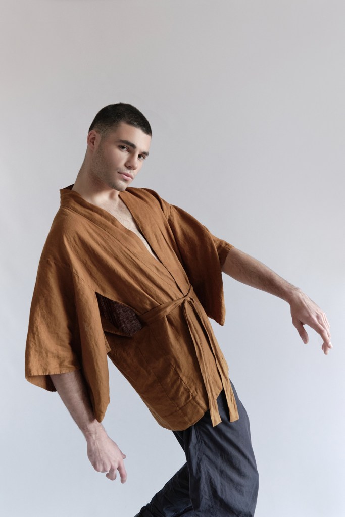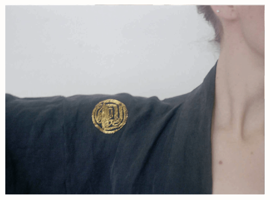 INK ORO kimono | 100% linen, lightweight | Relaxed fit with traditional sleeve, concealed pockets, hand-stitched hem, sash, zero waste pattern cutting and fine gold metallic couching details on front shoulder and top centre back.