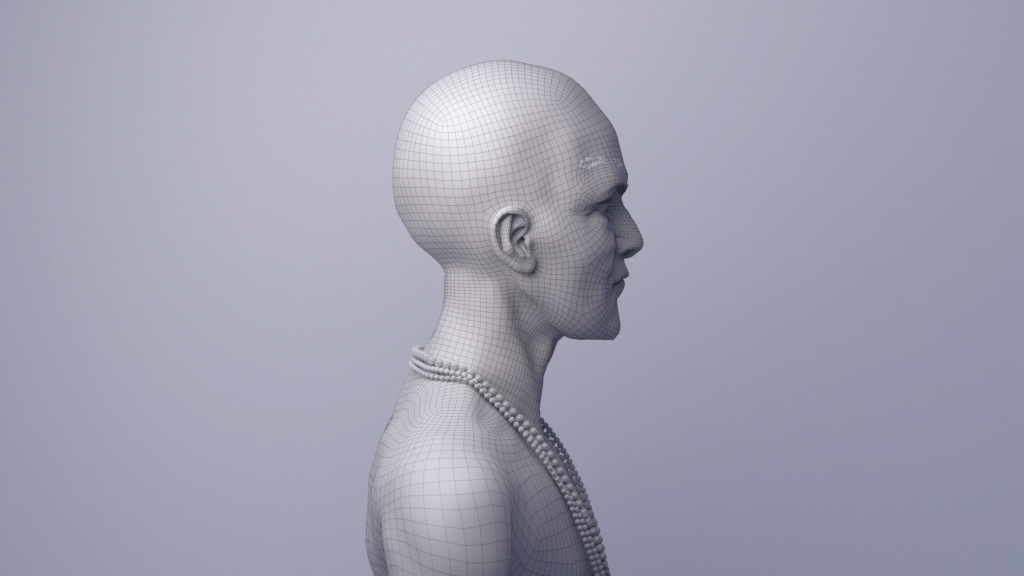 Initial sculpt, retopology, shape keys, sculpted pore and wrinkle detailing, hard surface modeling: eyes & jewellery, UV unwrapping, surfacing: utility texture baking, skin colour painting, skin material, specular variation & subsurface scattering zones, eye, jewellery & face paint materials, cloth modeling, simulation & materials (excluded in final renders), grooming & groom materials, lighting, compositing & rendering.