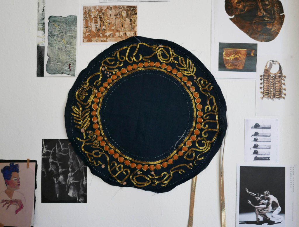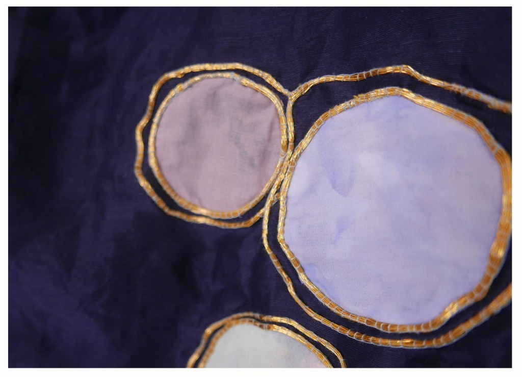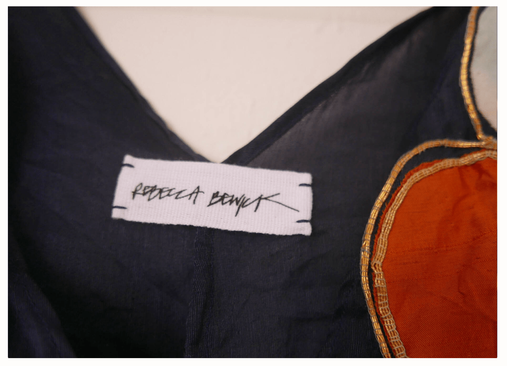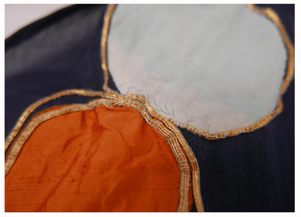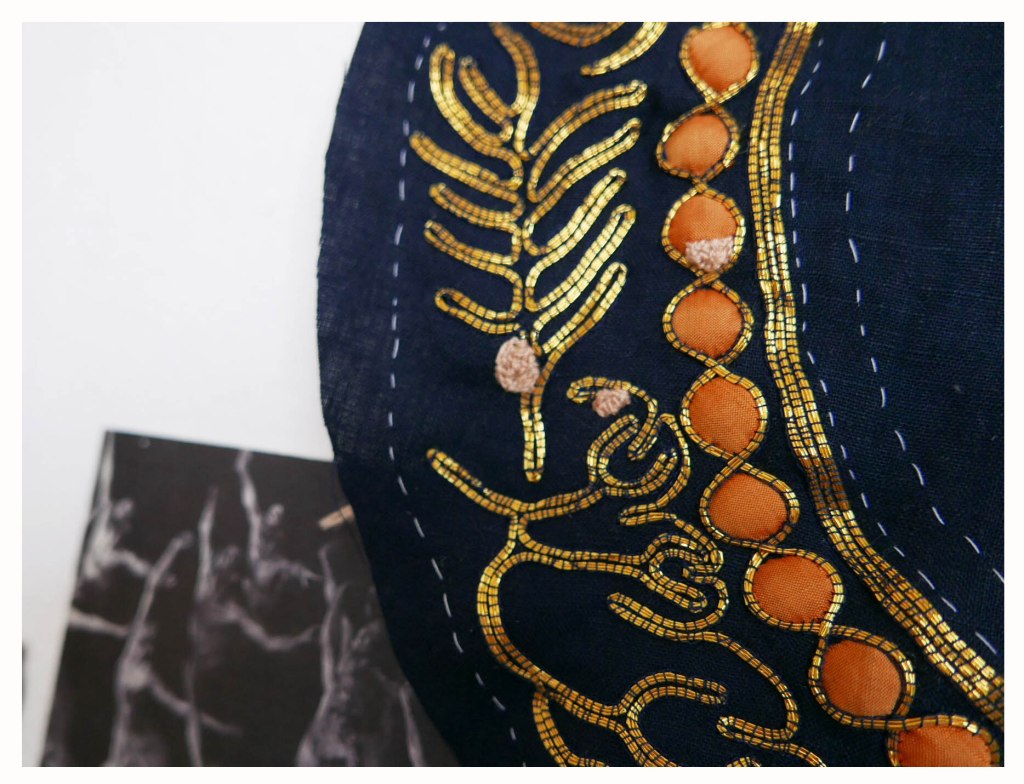 Carefully sourced linen appliquéd with upcycled hand-woven cambodian silk fabric with gold metallic couching.